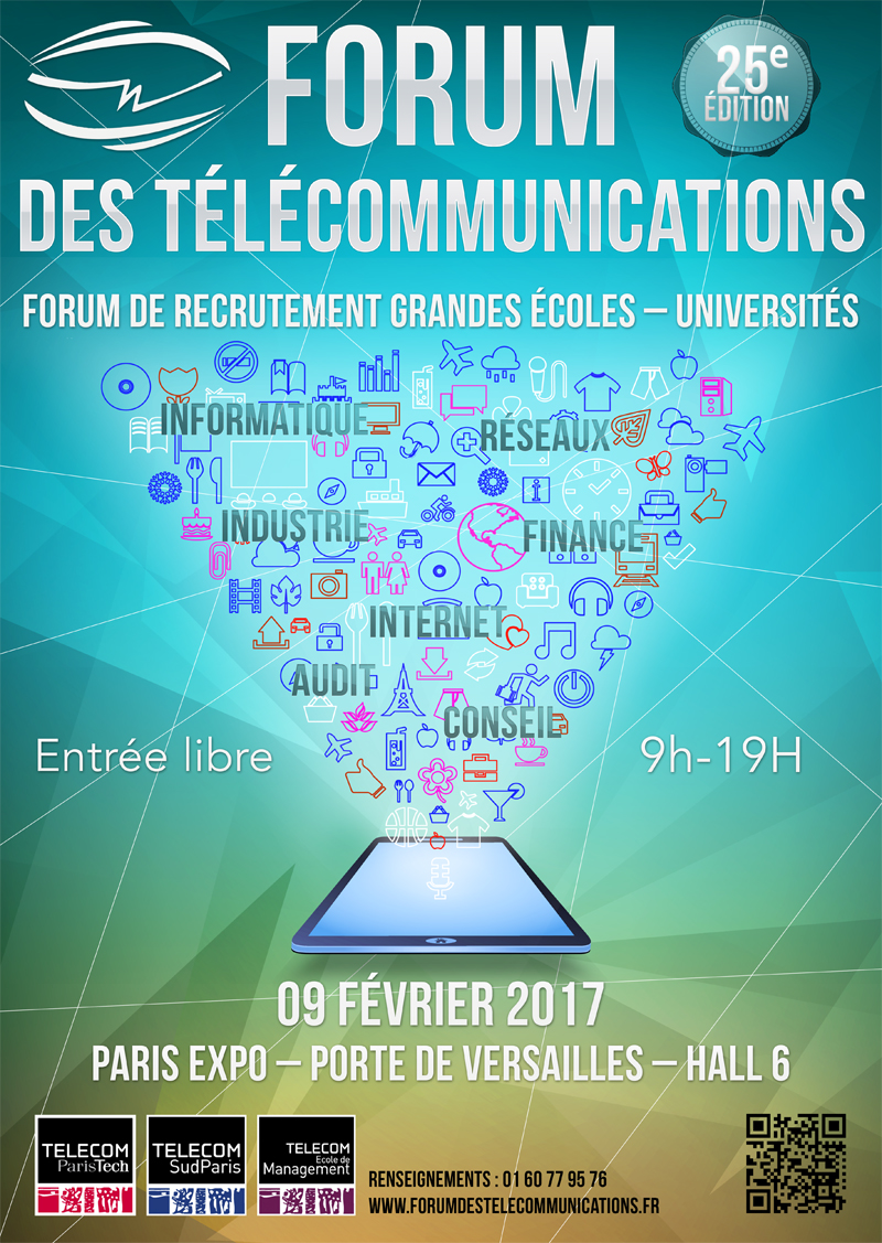 Télécom ParisTech, Télécom SudParis et Télécom Ecole de Management présentent la 25ème édition du Forum des Télécommunications A l'occasion de cette 25ème édition, le Forum des Télécommunications, événement majeur du recrutement en France, met en relation 4000 visiteurs avec plus d'une centaine d'entreprises ne se limitant pas aux télécommunications. En effet ces entreprises interviennent dans de nombreux secteurs tels que la finance,l’informatique, le conseil et l’industrie...